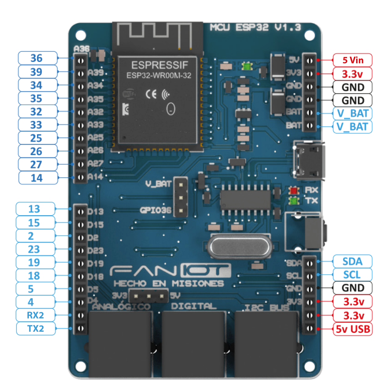 Es una placa profesional desarrollada por FanIOT basada en el microcontrolador ESP32-WROOM-32, ideal para proyectos técnicos que requieren conectividad WiFi/Bluetooth, múltiples GPIOs y flexibilidad para integrar sensores y actuadores.