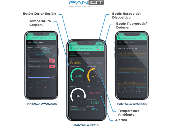 El termometro IOT IR-1000 dispone de accedo directo a una Aplicacion propietaria, Sin Cargo, para visualizar los datos en un Smartphone y/o Tablet, sumado a la Pantalla del Dispositivo. FanIOT App permite guardar datos Historicos, generar Alarmas y definir Configuraciones Avanzadas en Ubidots y ThingSpeak.