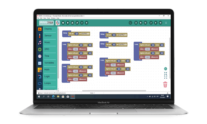 Los Módulos Educativos se encuentran asociadas a una interfaz gráfica de Programación en Bloques. Esto permite al estudiante abordar la programación desde una usabilidad amigable en la que integra conceptos de Robótica Educativa con IOT.