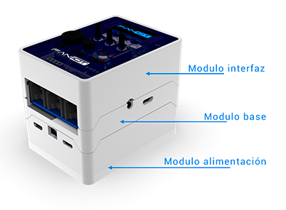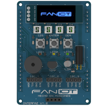 Funciona como interacción de usuarios, la cual posee una pantalla OLED, 3 pulsadores, 3 LEDs, 3 LEDs neopixels, un buzzer y sensores de temperatura y luz. Se utiliza en conjunto con el Módulo Base.